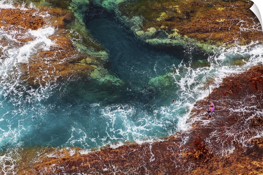 <p>A fisherman fishes a Beryx splendens down a cliff in Fuerteventura island, Canary Islands, Spain, Atlantic</p>