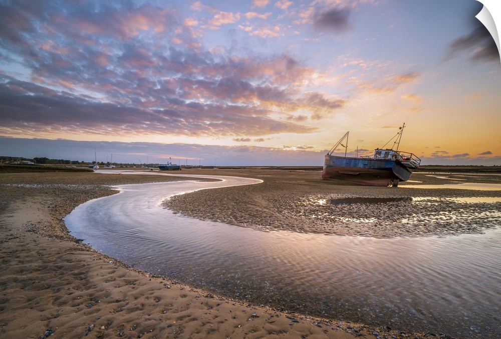 <p>A fishing boat next to a winding river through the sand during sunset at Mow Creek at Brancaster Staithe.</p>