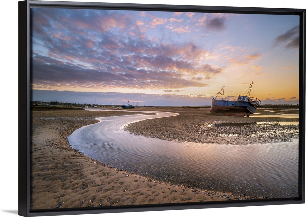 <p>A fishing boat next to a winding river through the sand during sunset at Mow Creek at Brancaster Staithe.</p>