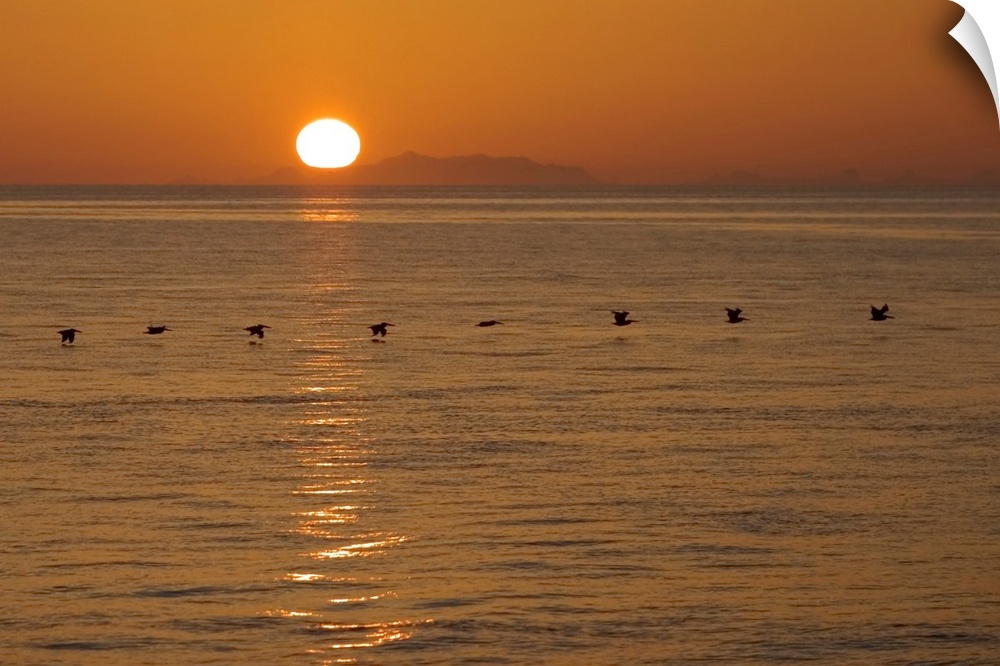 <p>A flock of brown pelicans flying low over water at sunset.</p>