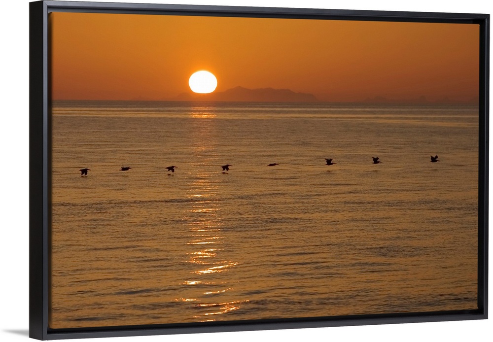 <p>A flock of brown pelicans flying low over water at sunset.</p>