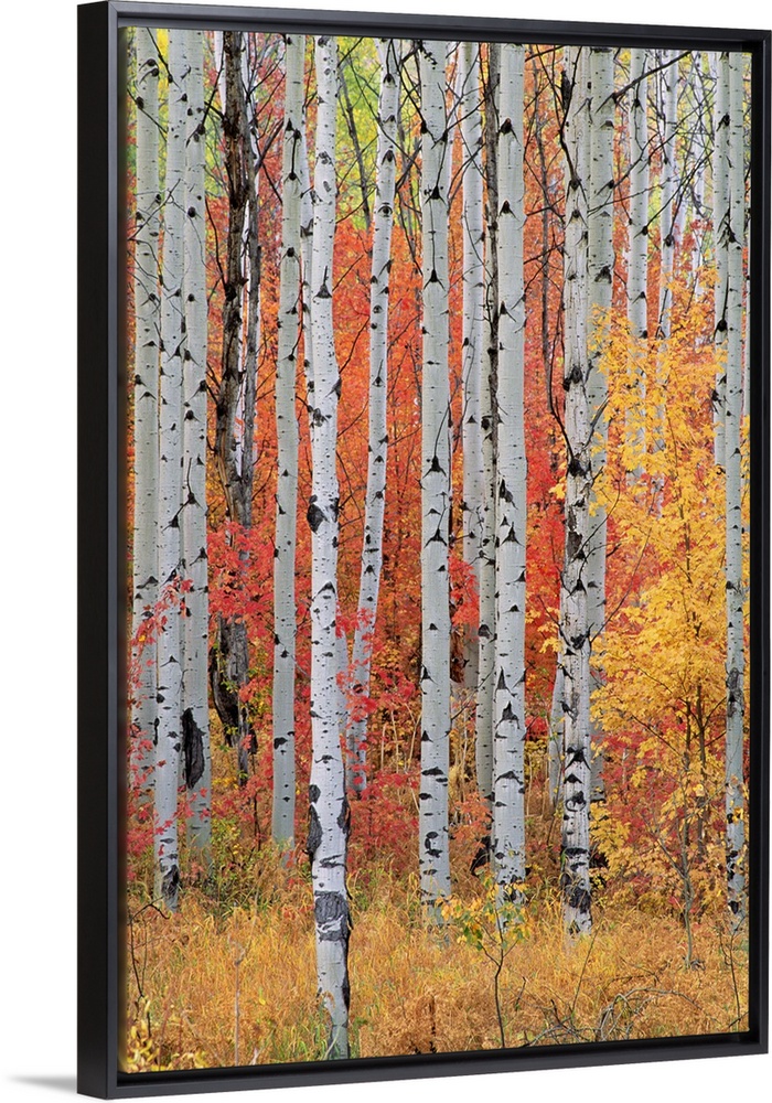 <p>A forest of aspen and maple trees in the Wasatch mountains, with striking yellow and red autumn foliage.</p>