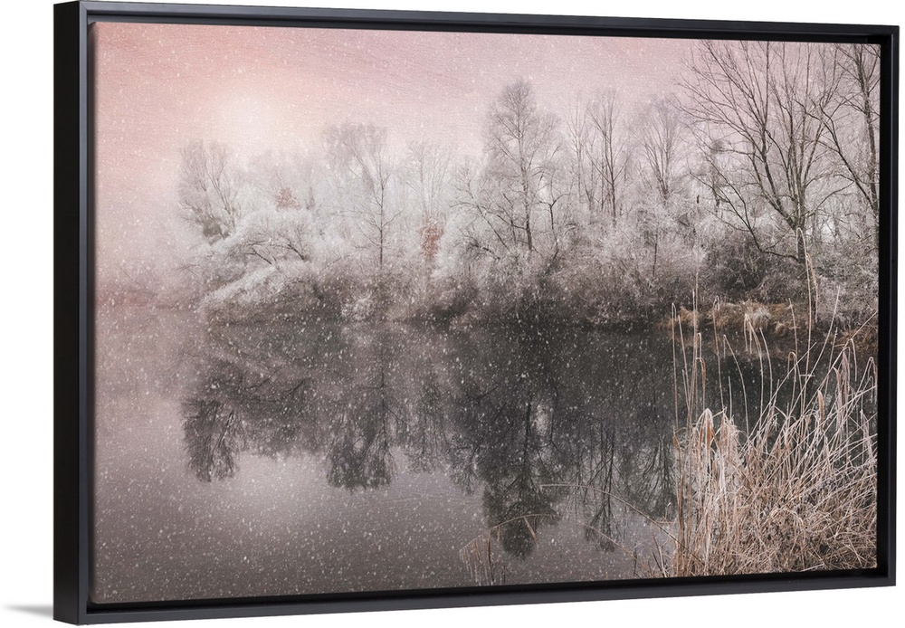 <p>Magenta toned dreamy photograph of snowfall over a calm lake surrounded by winter trees.</p>