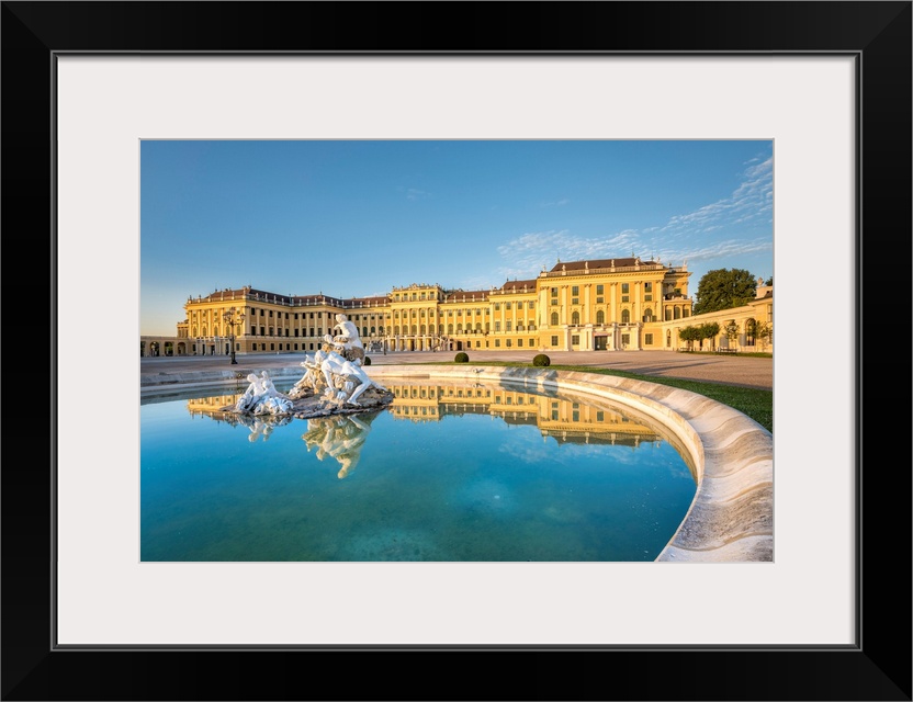 <p>Vienna, Austria, Europe. The Schonbrunn Palace At Sunrise. A Fountain In The Forecourt With The Sculptures Danube, Inn, And Enns</p>