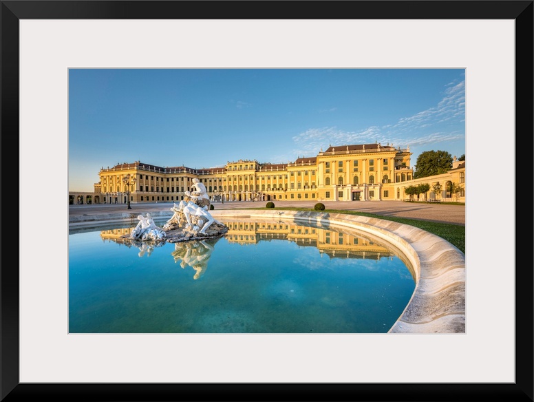 <p>Vienna, Austria, Europe. The Schonbrunn Palace At Sunrise. A Fountain In The Forecourt With The Sculptures Danube, Inn, And Enns</p>