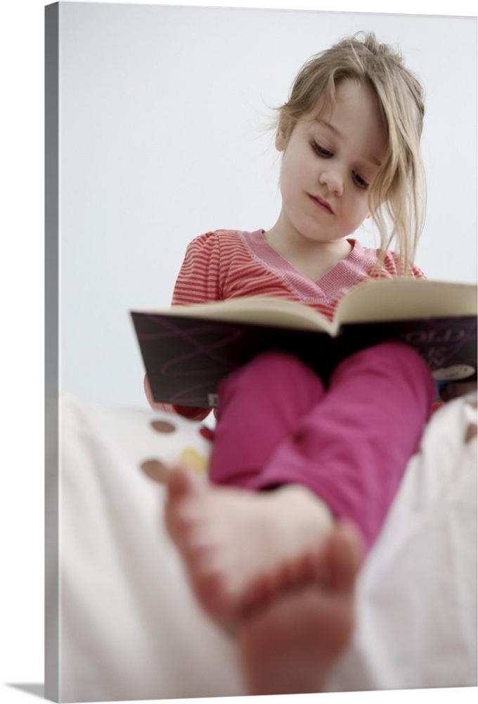 <p>A four-year-old girl reads a book while sitting on her bed.</p>
