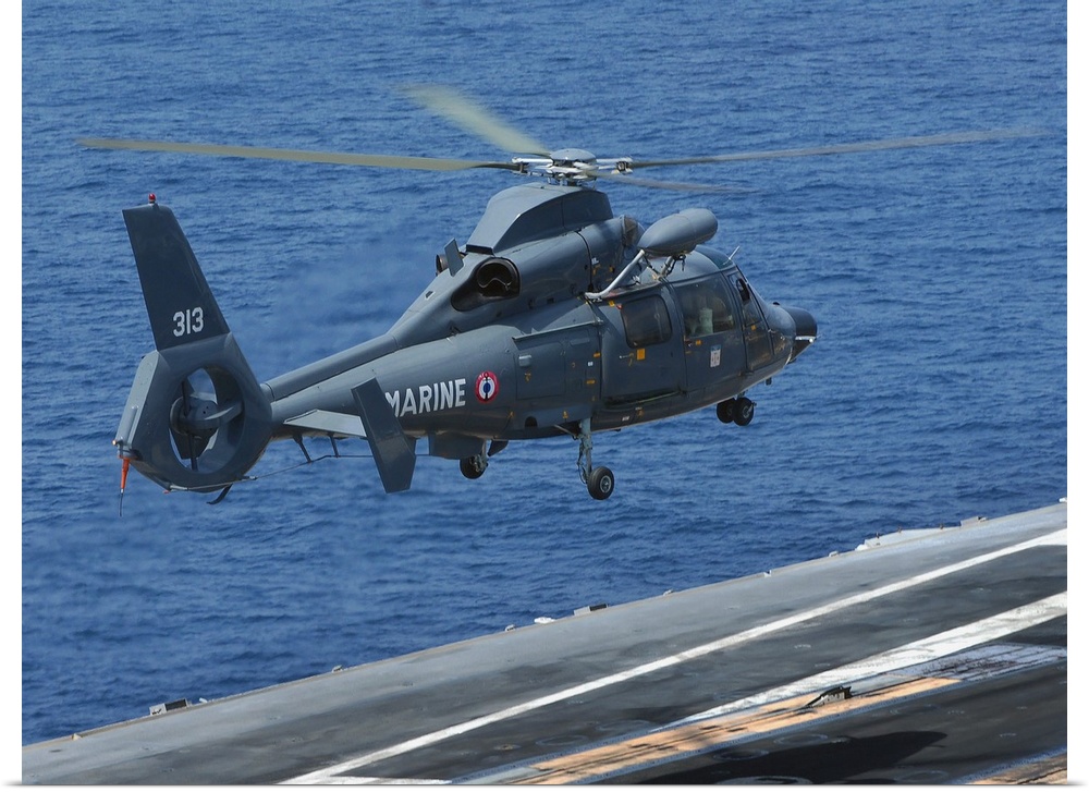 <p>A French Dolphin 35F helicopter takes off from the flight deck of USS John C. Stennis.</p>