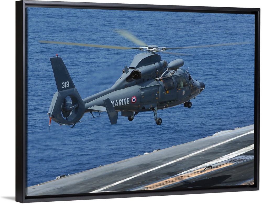<p>A French Dolphin 35F helicopter takes off from the flight deck of USS John C. Stennis.</p>