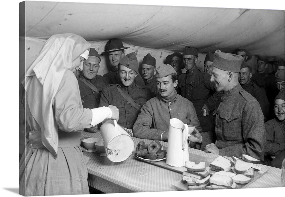 <p>A French infantryman surrounded by Americans in an American red cross canteen.</p>