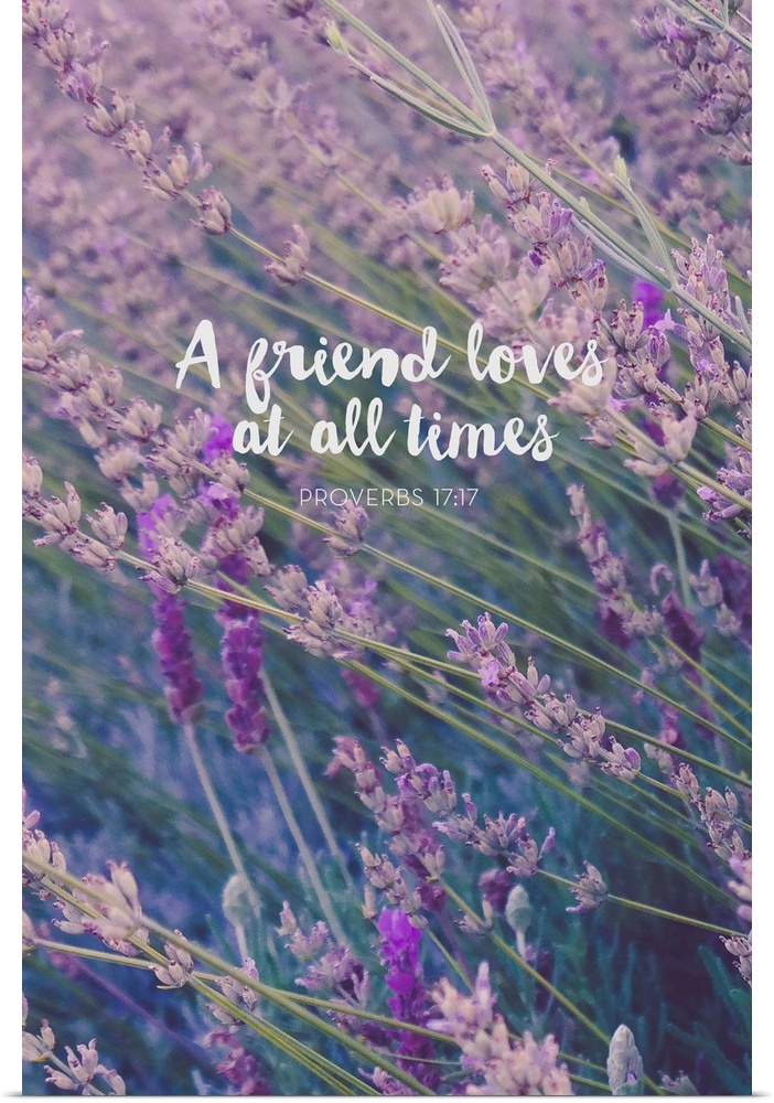 <p>Typography art with a bible verse from Proverbs 17:17 over an image of wildflowers.</p>