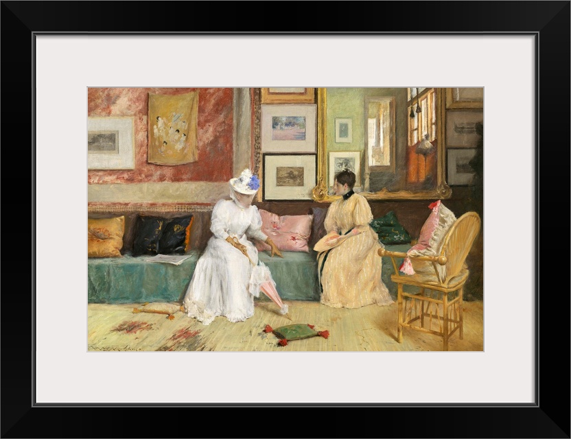 <p>A Friendly Call, by William Merritt Chase, 1895, American impressionist painting, oil on canvas. The 'visit' took place in Chase's own studio at his summer home near Shinnecock, Long Island. The painter's wife, Alice Gerson Chase, greets an unidentified c</p>