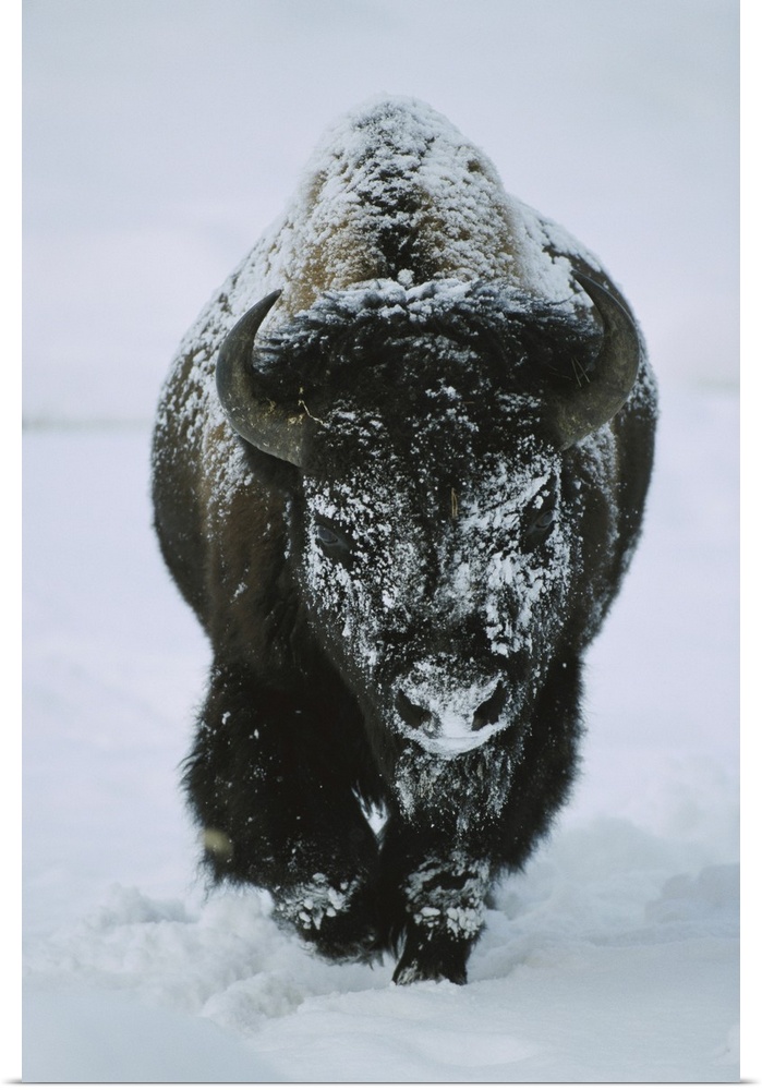 <p>A frost-covered American bison bull (Bison bison) walks through the snow in Yellowstone National Park, United States of America</p>
