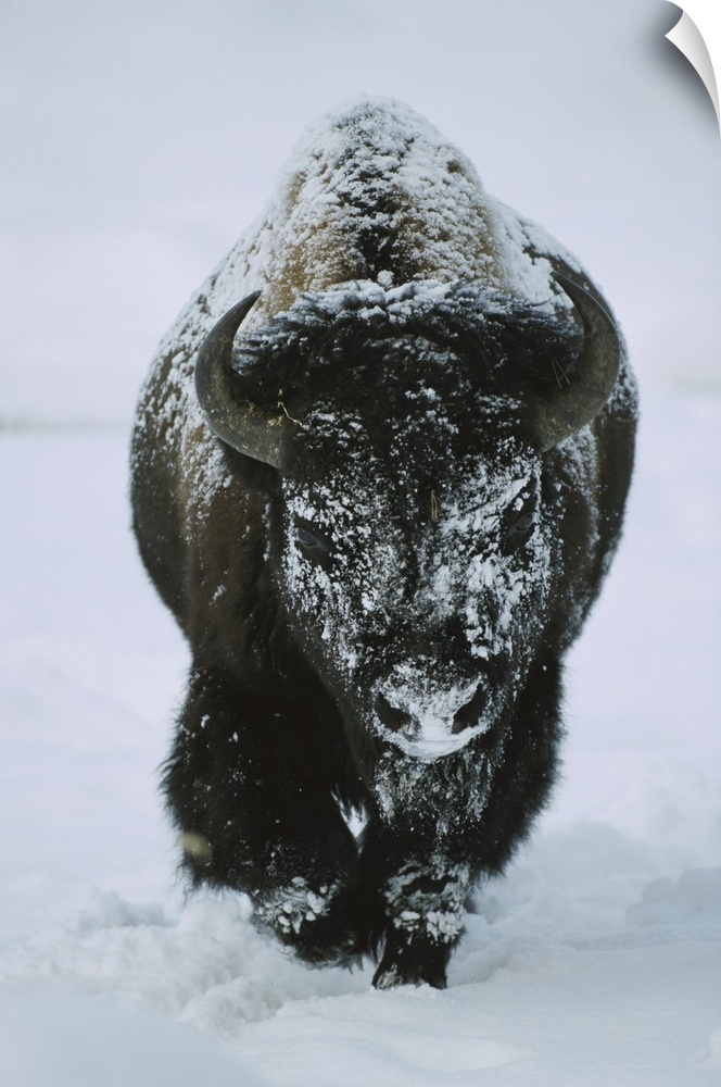 <p>A frost-covered American bison bull (Bison bison) walks through the snow in Yellowstone National Park, United States of America</p>