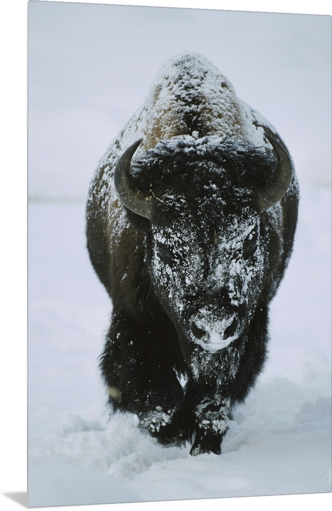 <p>A frost-covered American bison bull (Bison bison) walks through the snow in Yellowstone National Park, United States of America</p>