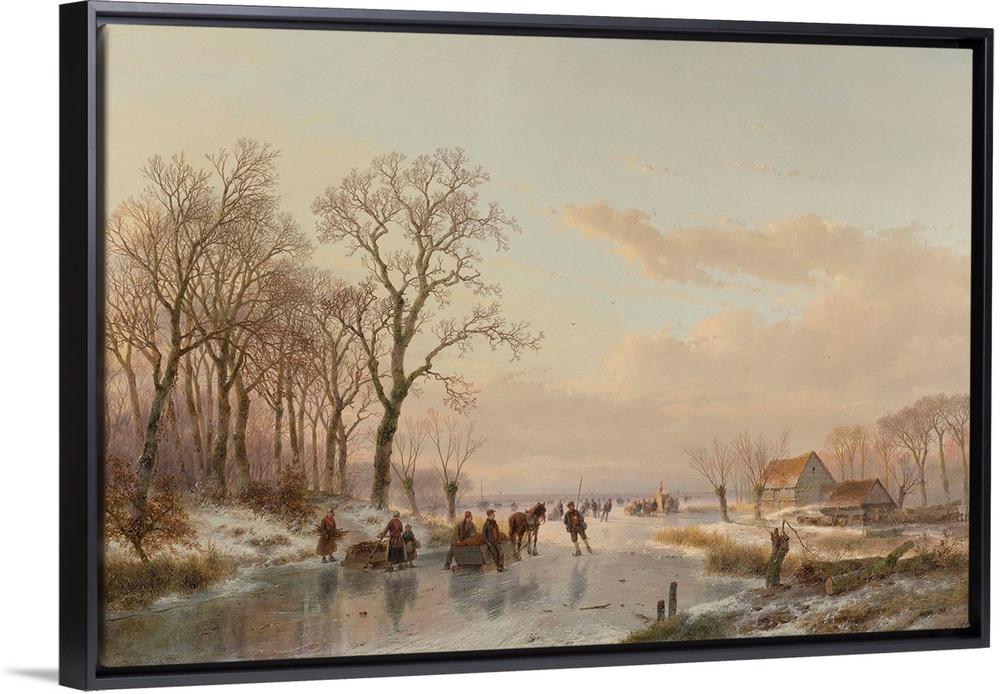 <p>A Frozen Canal Near the River Maas, by Andreas Schelfhout, 1867, Dutch painting, oil on canvas. Frozen winter scenes, with various people on the ice on skates, with sleds. Near the barn is a vendor's stall flying a Dutch flag.</p>