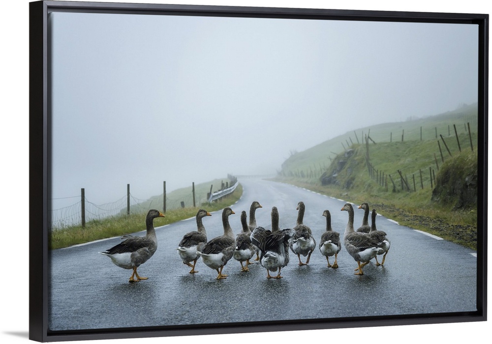 <p>A gaggle of geese walking along a road close to the village of Bour. Island of Vagar. Faroe Islands.</p>