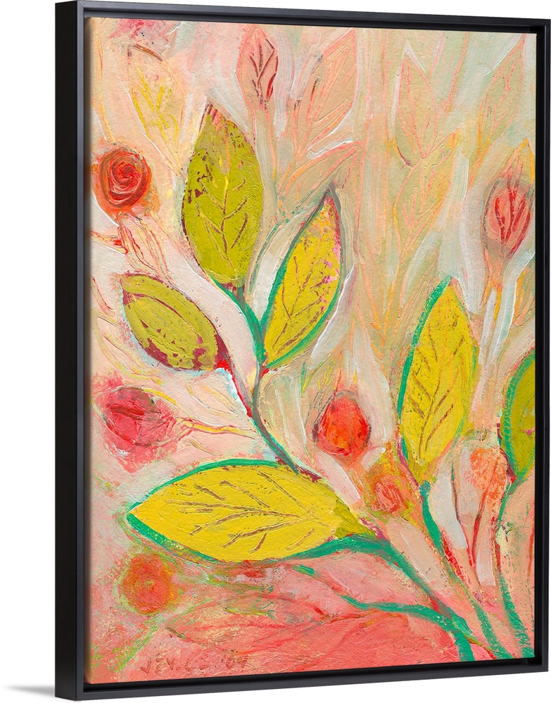 <p>Vertical, floral painting on large canvas of a large branch of leaves reaching diagonally from the lower right. Surrounded by small flowers and more leaves in the background.</p>