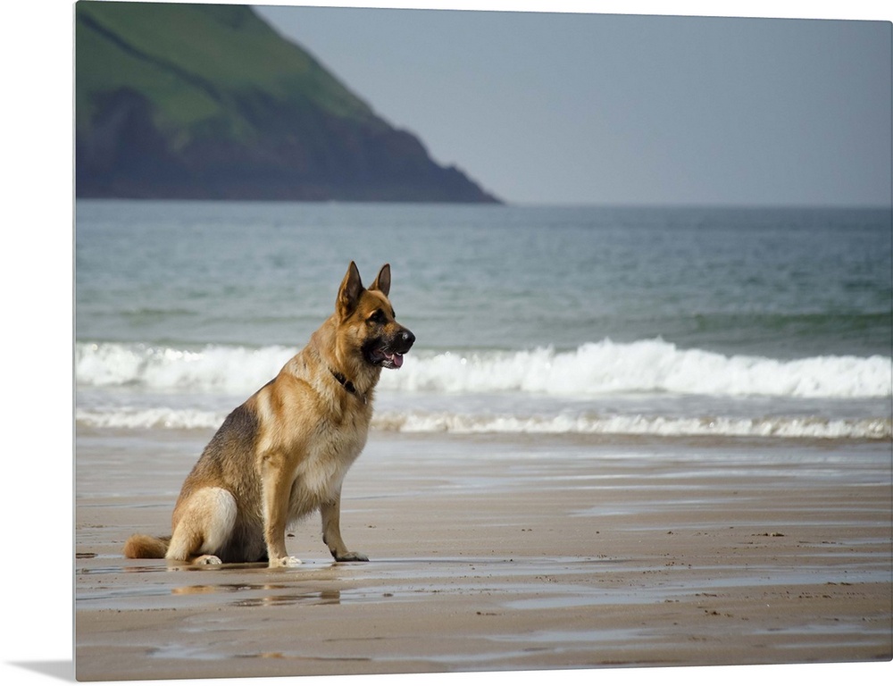 <p>Five year old male German shepherd sitting on a beach waiting to be called. Croyde, North Devon, UK.</p>