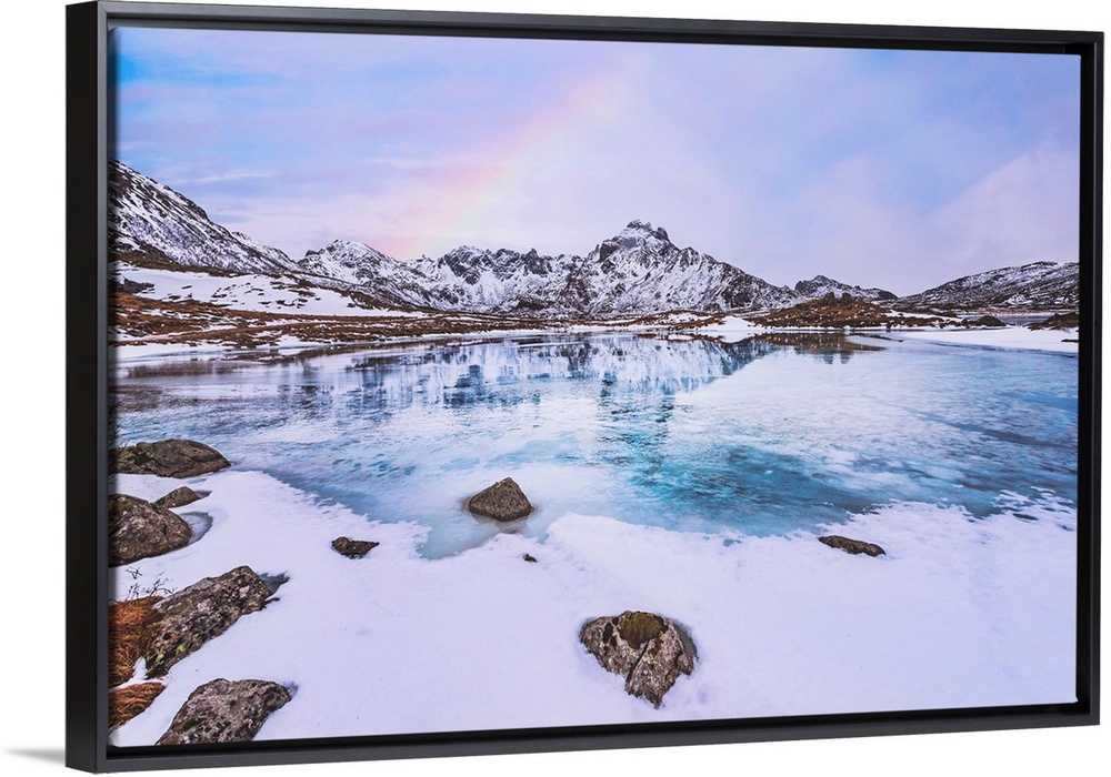 <p>Frozen lake in the mountains with a rainbow</p>
