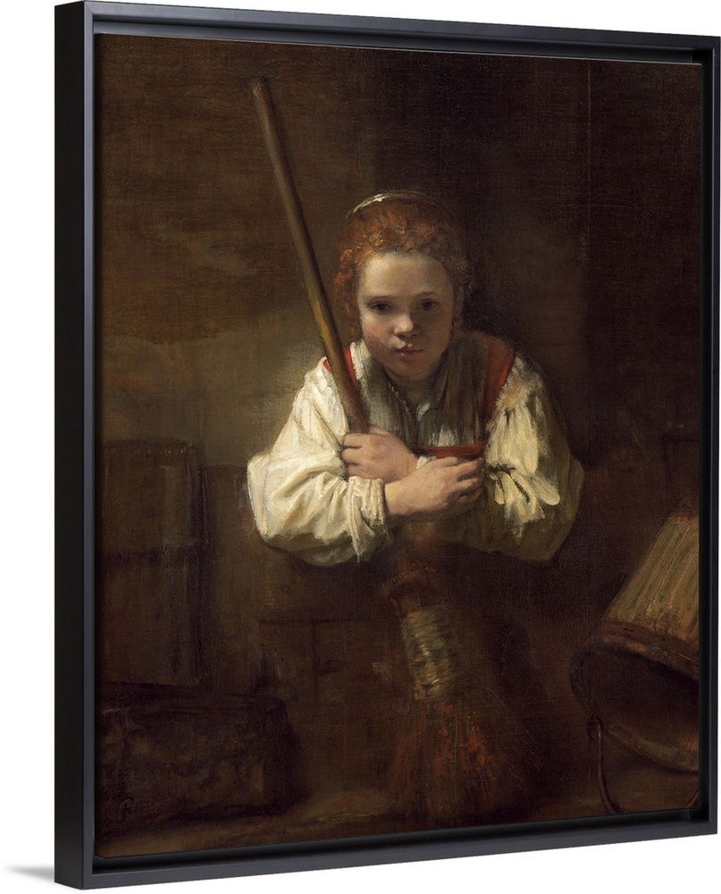 <p>A Girl with a Broom, by Rembrandt's workshop, 1651, Dutch painting, oil on canvas. A young girl, holding a broom, stares directly at the viewer. Carel Fabritius, who trained in the Rembrandt?s workshop, is thought to be artist</p>