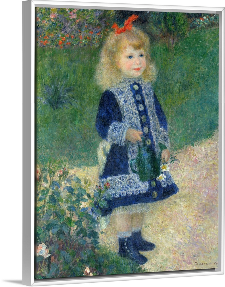 <p>A Girl with a Watering Can, by Auguste Renoir, 1876, French impressionist painting, oil on canvas. This is one of Renoir's most popular works: a charming light-filled scene with a pretty child in fancy dress</p>