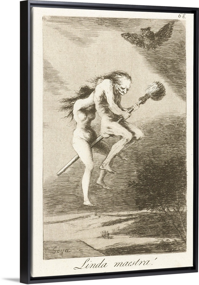 <p>A Good Mistress, by Francisco Goya, 1797-99, Spanish print, drypoint, etching, on paper. Witches, old and a young apprentice, flying on broomstick, above a landscape. This satirical etching targeted ignorance and superstition, was in Goya's 'Los Caprichos</p>