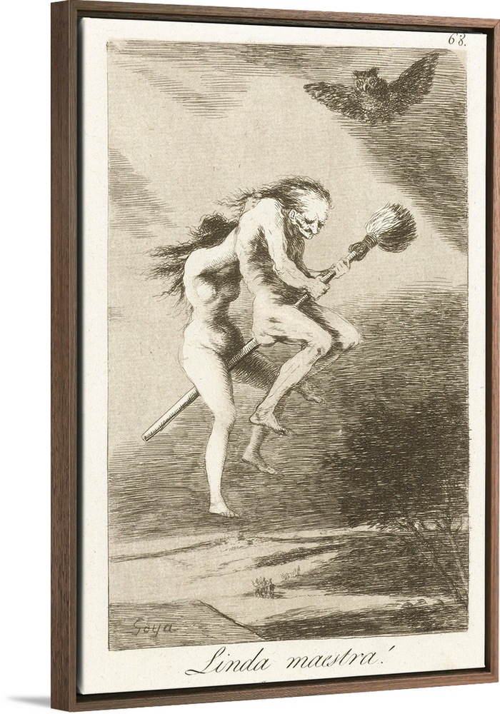 <p>A Good Mistress, by Francisco Goya, 1797-99, Spanish print, drypoint, etching, on paper. Witches, old and a young apprentice, flying on broomstick, above a landscape. This satirical etching targeted ignorance and superstition, was in Goya's 'Los Caprichos</p>
