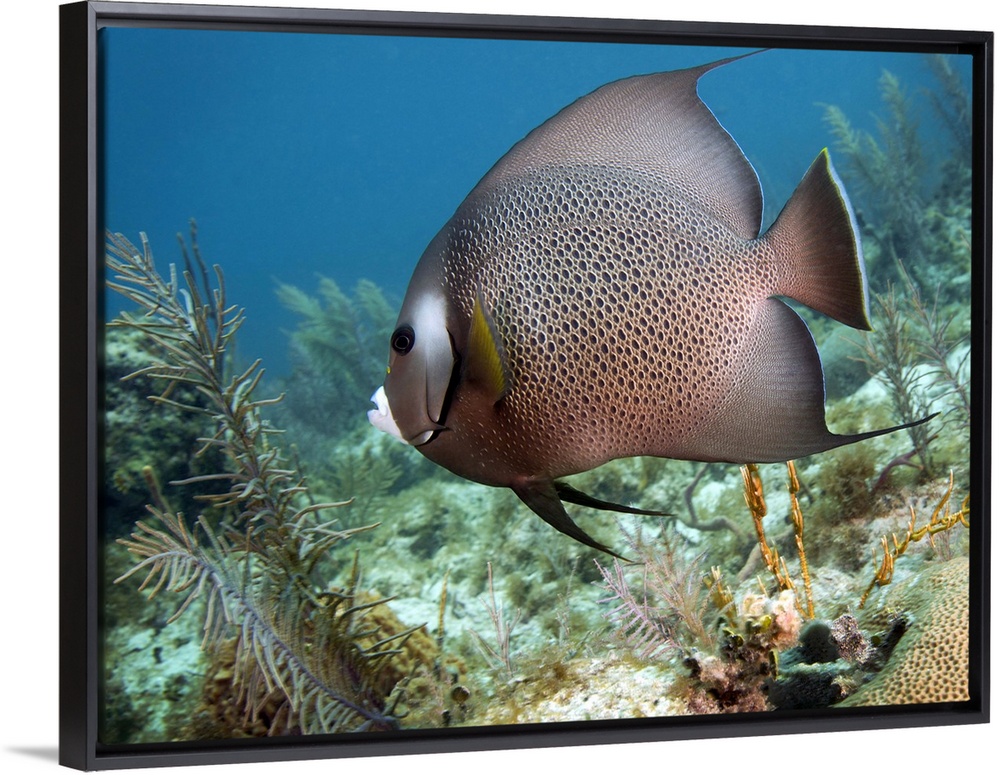 <p>A Gray Angelfish (Pomacanthus arcuatus) swims by diamond and fire corals in the shallow waters of the Atlantic Ocean off the coast of Key Largo, Florida.</p>