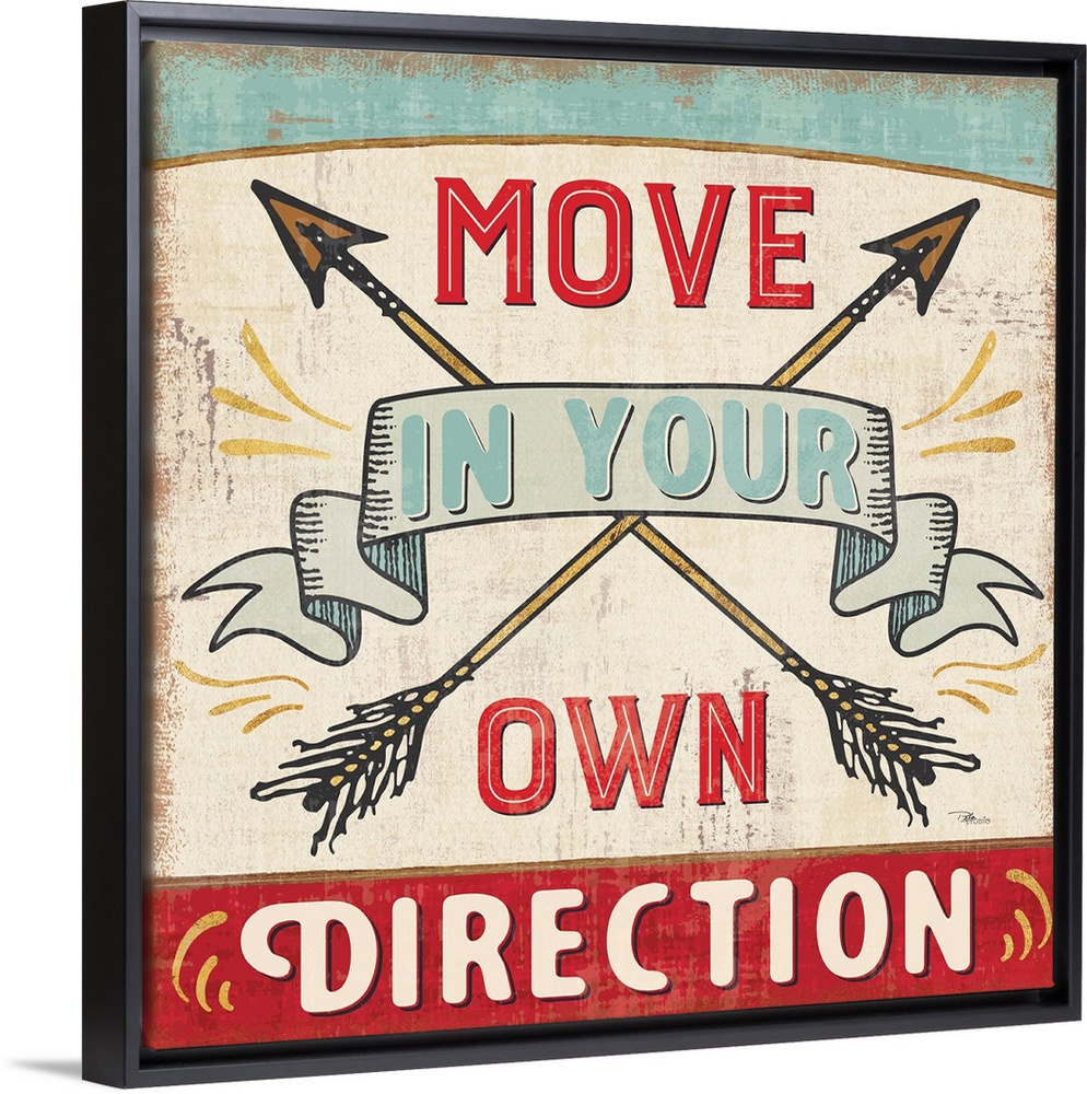 <p>Vintage style sign with crossed arrows reading "Move in your own direction."</p>