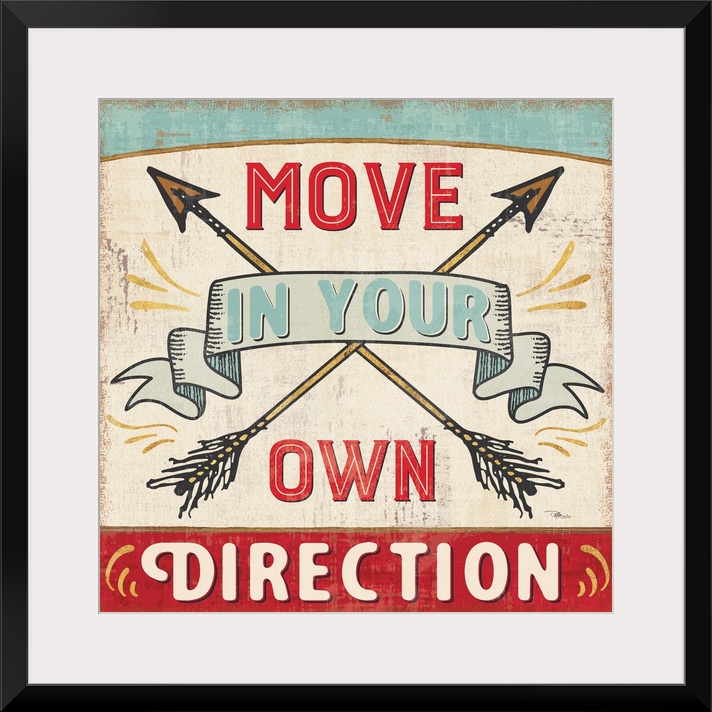 <p>Vintage style sign with crossed arrows reading "Move in your own direction."</p>