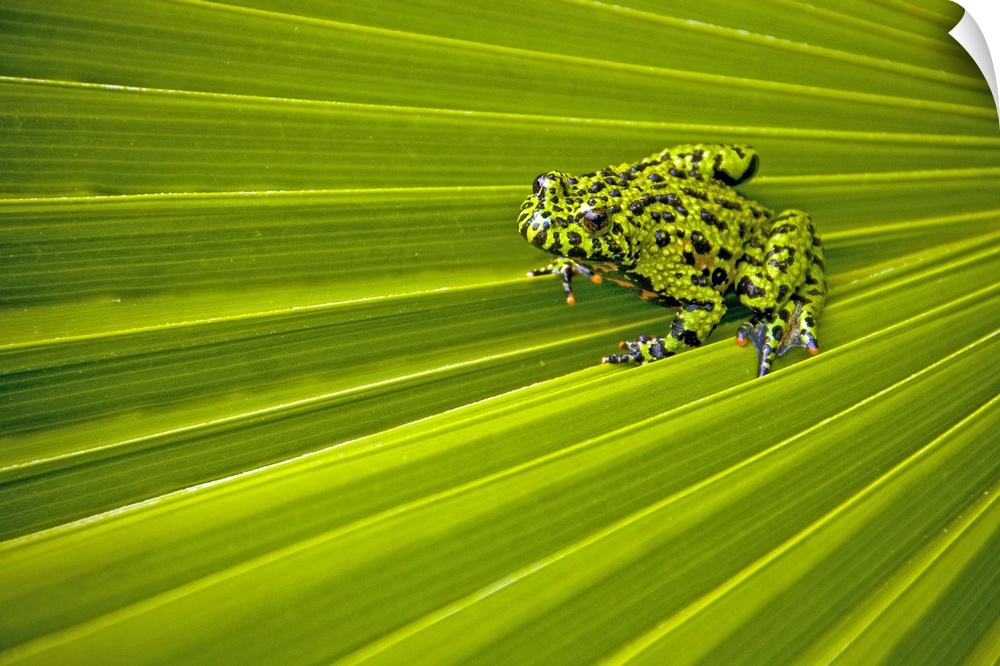 <p>A green amphibian with orange feet sits atop the green foliage of a palm plant in a suburban garden near Dallas, Texas</p>