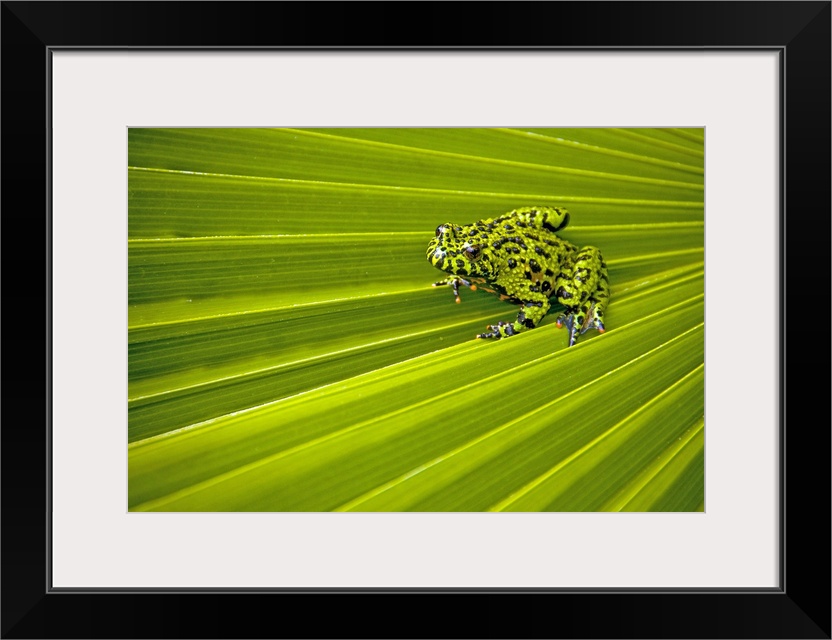 <p>A green amphibian with orange feet sits atop the green foliage of a palm plant in a suburban garden near Dallas, Texas</p>