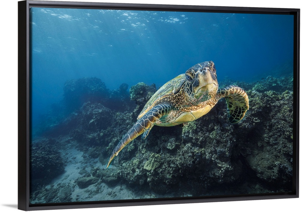 <p>A green sea turtle (chelonia mydas), an endangered species, glides past an underwater lava ridge off Maui, Hawaii, united states of America.</p>