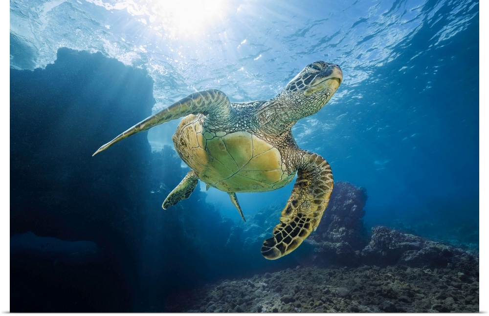 <p>A green sea turtle (chelonia mydas), an endangered species, glides past an underwater lava ridge off Maui, Hawaii, united states of America.</p>
