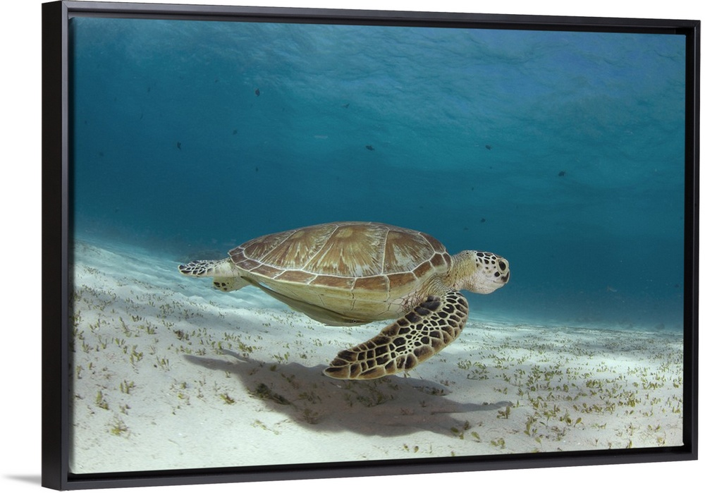 <p>A green sea turtle (Chelonia mydas) swims in the shallows of the blue water in Palawan, Philippines.</p>