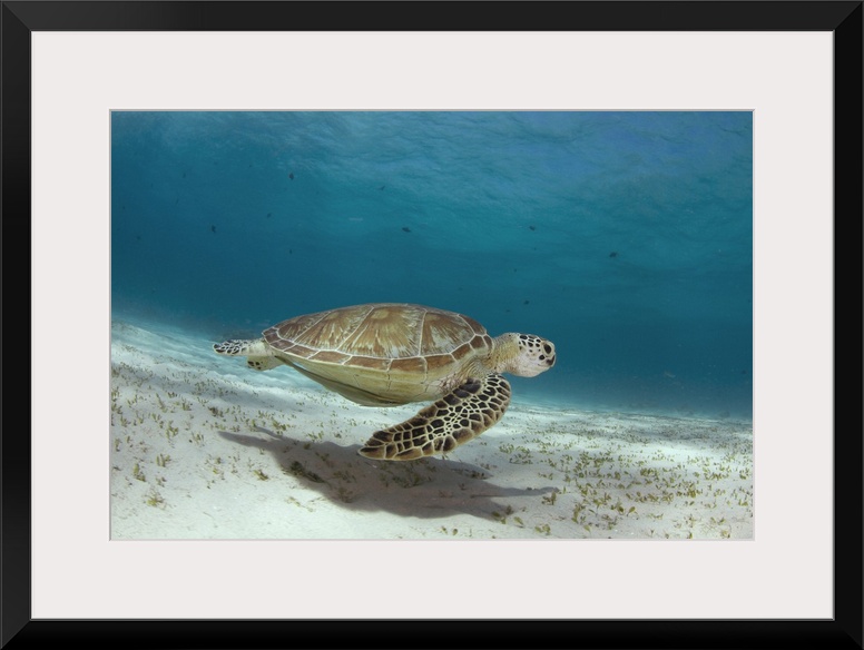 <p>A green sea turtle (Chelonia mydas) swims in the shallows of the blue water in Palawan, Philippines.</p>