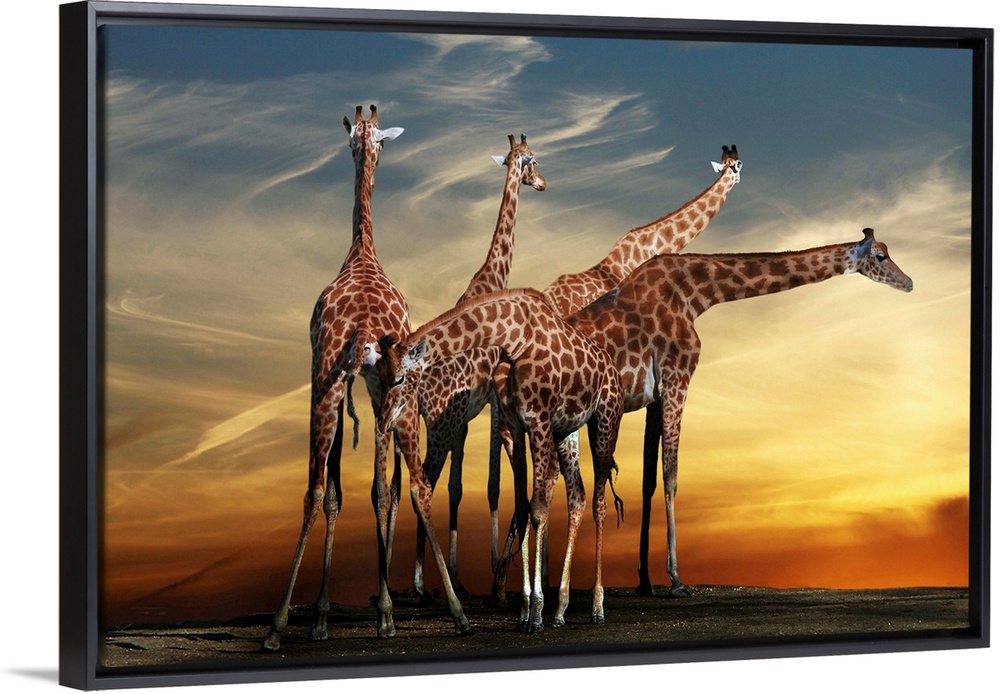 <p>A group of giraffes underneath a dramatic sunset sky.</p>