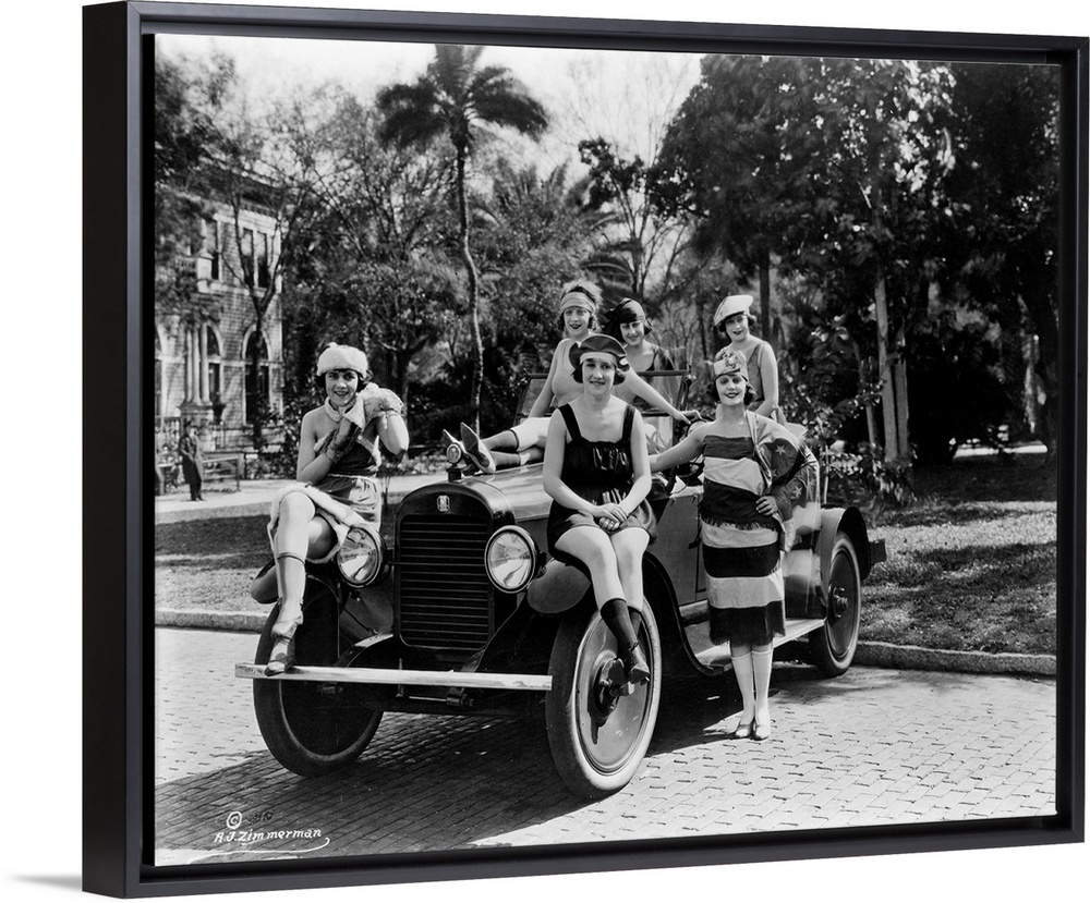 <p>A group of Bathing Beauties posing with a Columbia Six Sport Automobile in Florida, c1920.</p>
