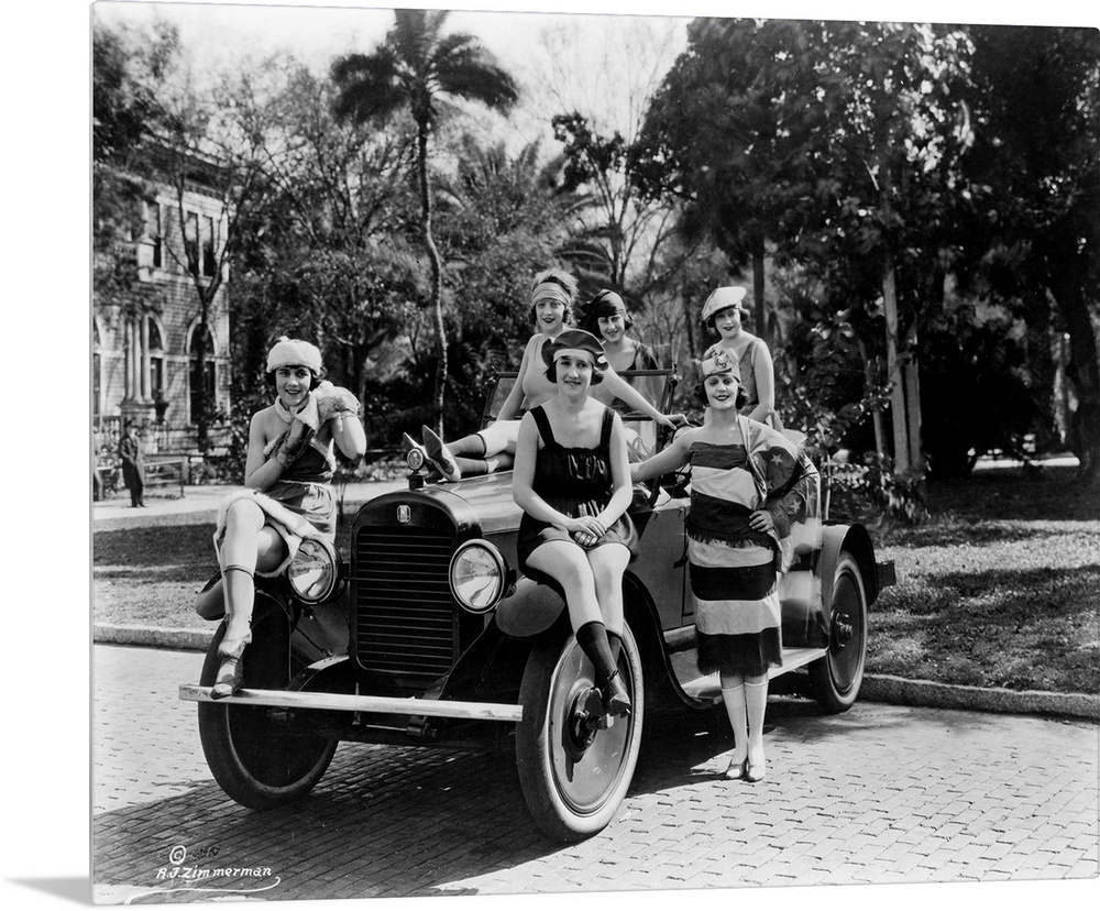<p>A group of Bathing Beauties posing with a Columbia Six Sport Automobile in Florida, c1920.</p>