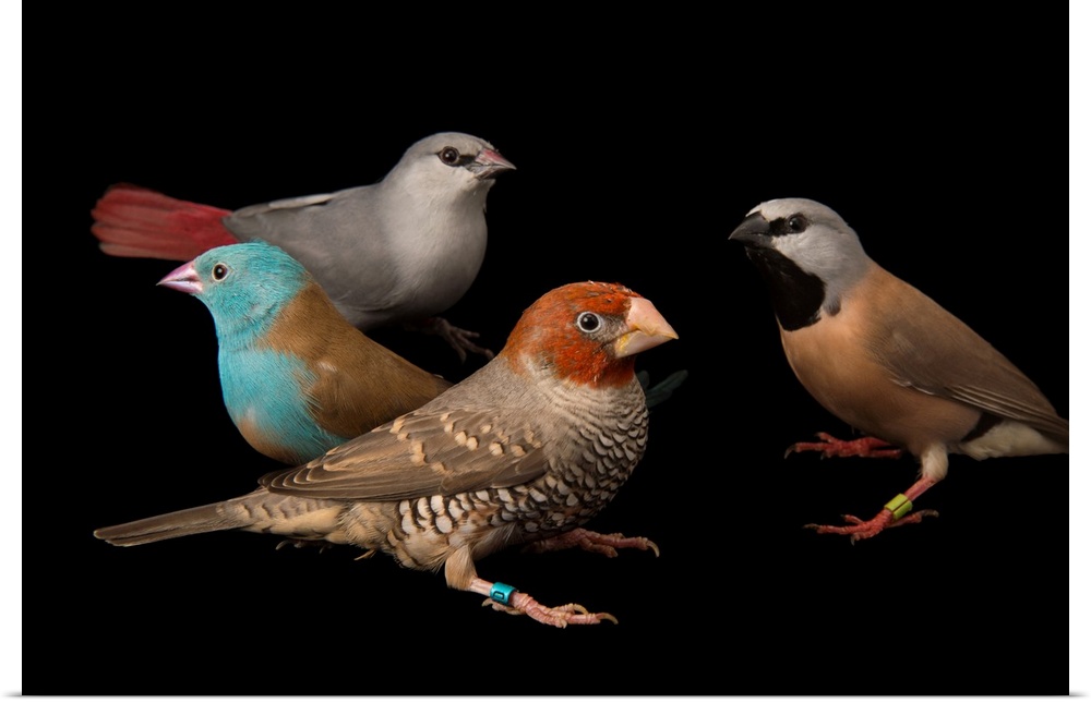 <p>A group of finches including a blue-headed cordon-bleu, Uraeginthus cyanocephala, a lavender waxbill, Estrilda caerulescens, a red-headed finch, Amadina erythrocephala, and a white-rumped parson finch, Poephila cincta cincta, at the Tulsa Zoo.</p>