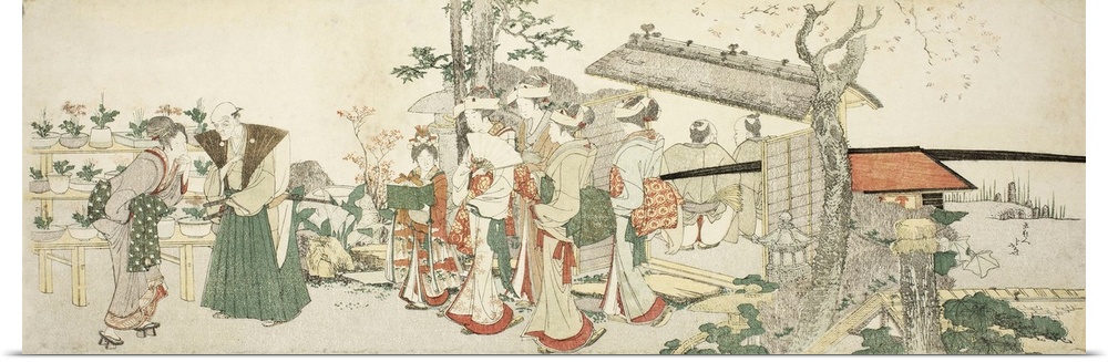 <p>A Group of Young Women Entering the Garden of a Horticulturist, colour woodblock print; surimono.</p>