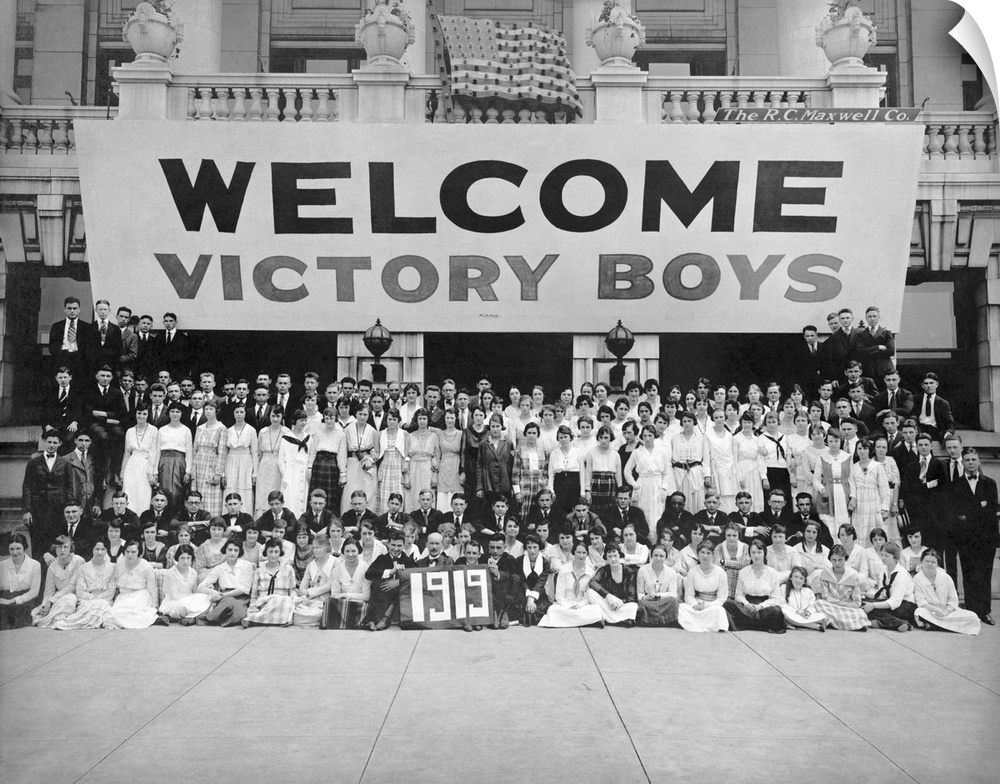 <p>A group portrait of people welcoming home World War I soldiers under a banner that reads: Welcome Victory Boys. The photo was taken outside Trenton City Hall, Trenton, New Jersey, 1919.</p>