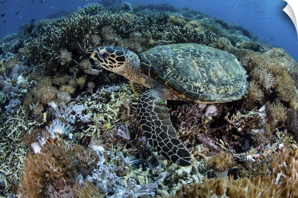<p>A hawksbill sea turtle lays on a reef in Komodo National Park, Indonesia.</p>