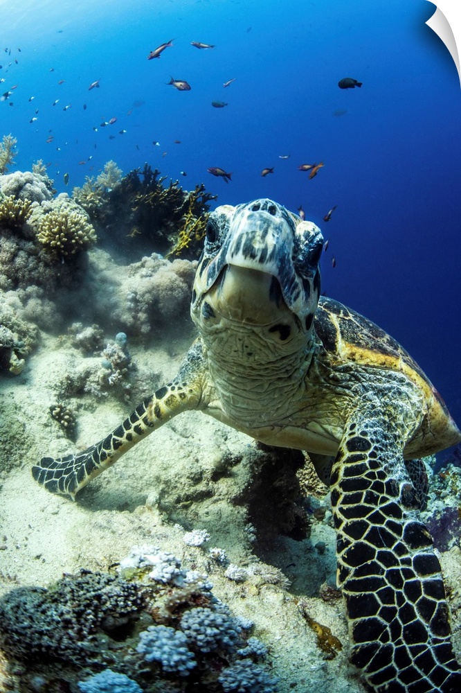 <p>A hawksbill turtle pauses on a coral reef.</p>