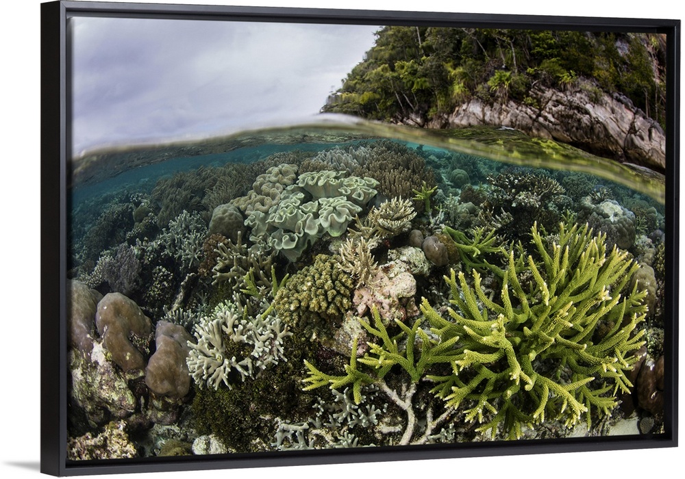 <p>A healthy and beautiful coral reef thrives in shallow water in Raja Ampat, Indonesia.</p>