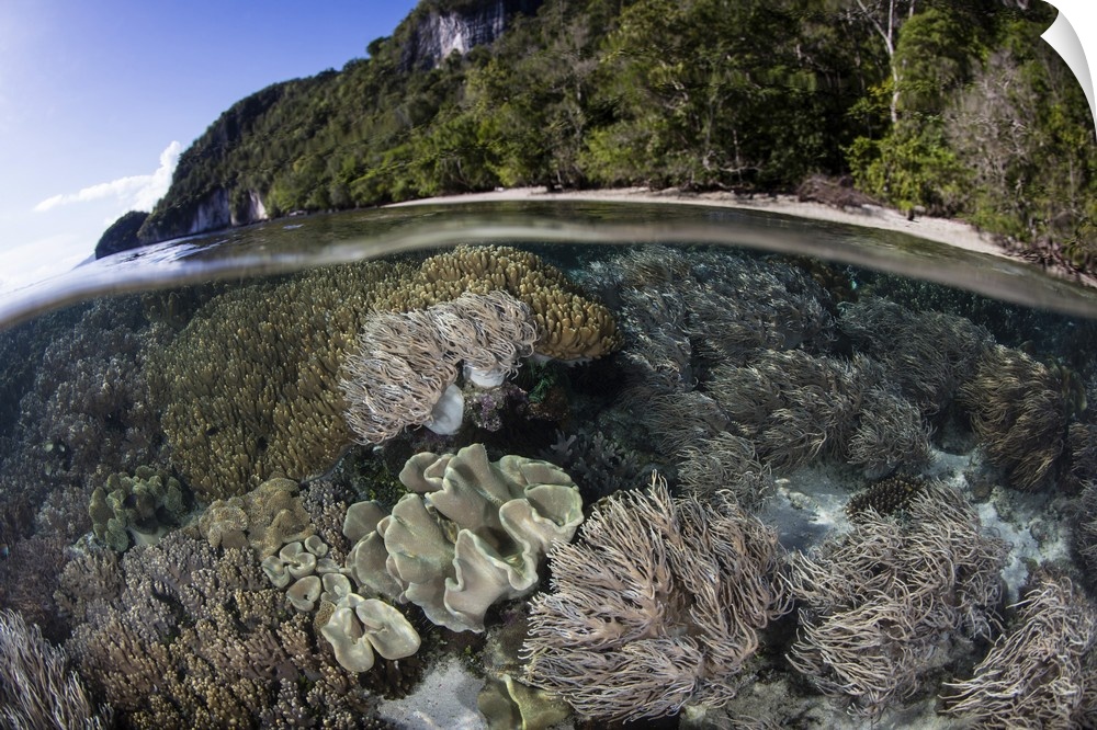 <p>A healthy coral reef grows along the edge of limestone islands in Raja Ampat, Indonesia. This remote, tropical region is home to extraordinary marine biodiversity.</p>