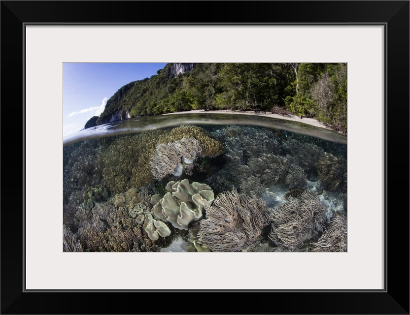 <p>A healthy coral reef grows along the edge of limestone islands in Raja Ampat, Indonesia. This remote, tropical region is home to extraordinary marine biodiversity.</p>