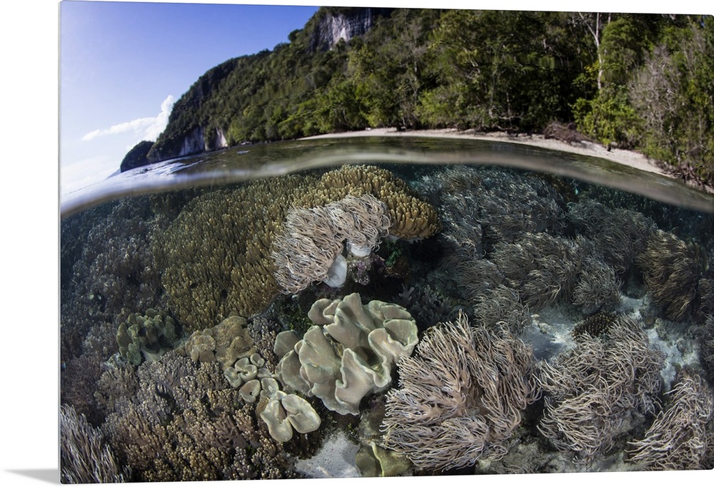 <p>A healthy coral reef grows along the edge of limestone islands in Raja Ampat, Indonesia. This remote, tropical region is home to extraordinary marine biodiversity.</p>