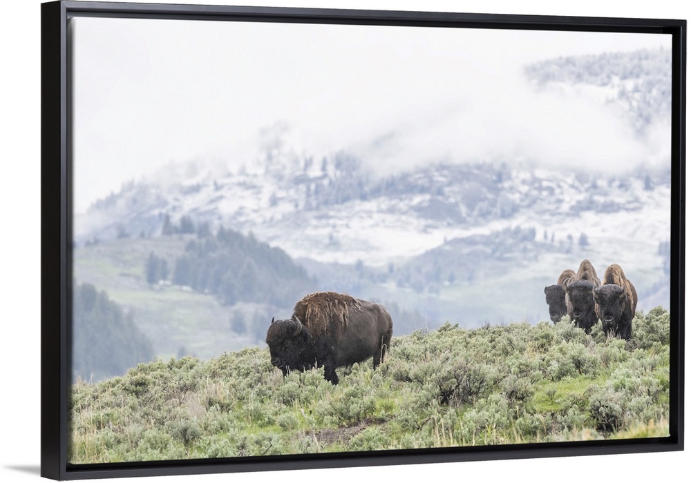 <p>A herd of American Bison (Bison bison) grazes in a sagebrush meadow with hills and a snowy mountainside in the background in Lamar Valley of Yellowstone National Park Wyoming, United States of America</p>