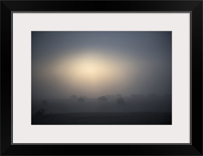 <p>Bison in a field with mist in the morning at Yellowstone National Park, Wyoming.</p>